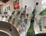 5、转瓶之后就可以进行“除渣”(degorgement)了。先把瓶颈冷冻,然后撬开啤酒盖,酵母沉淀就会在瓶中压力的推动下从瓶口弹出。