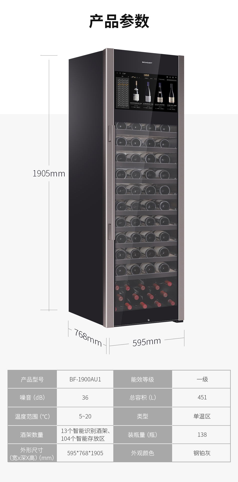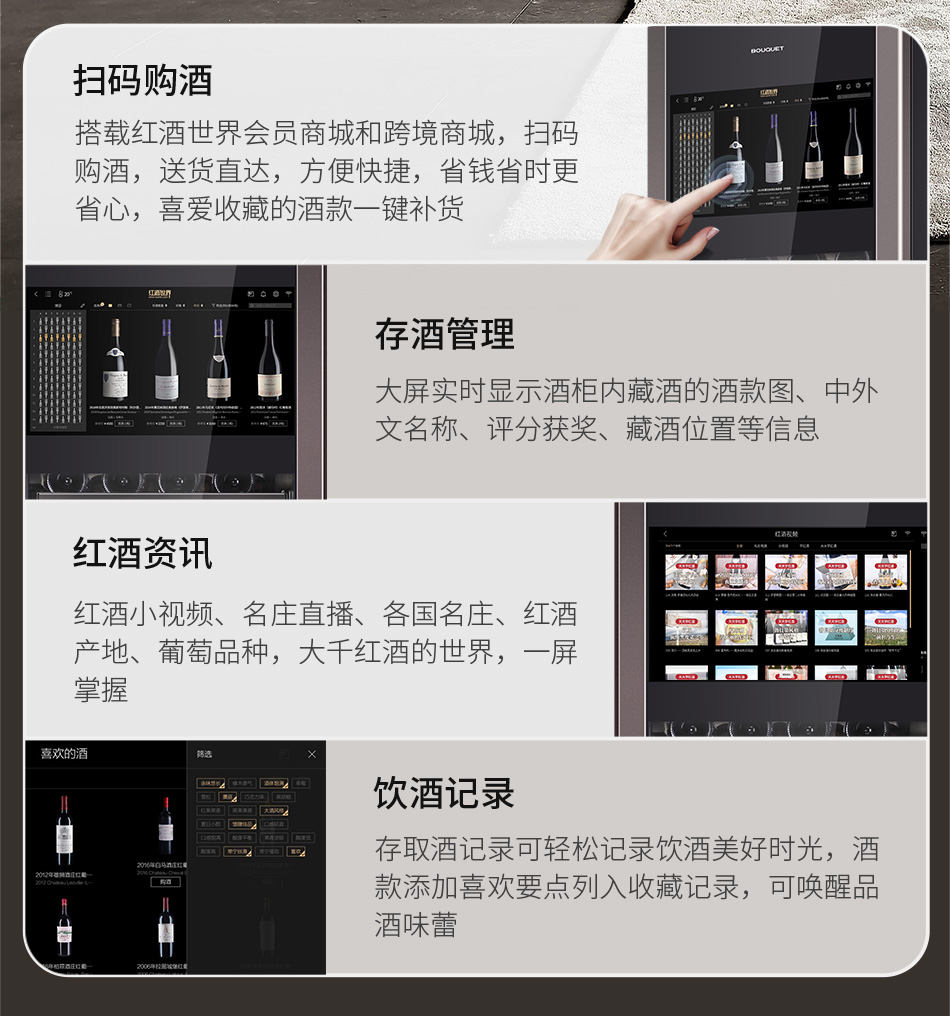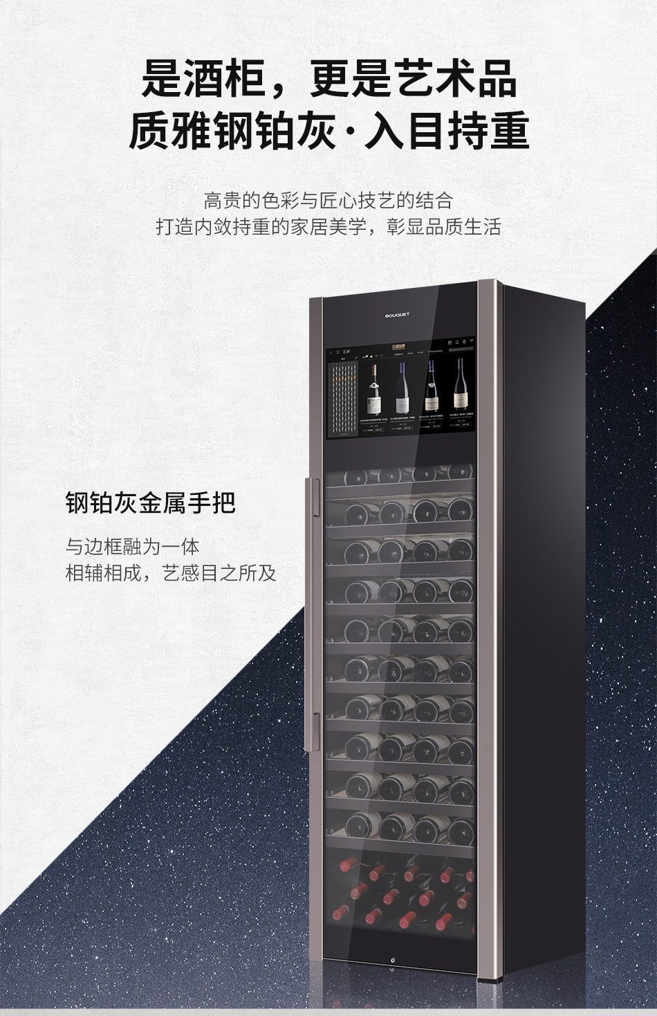 推荐质雅钢铂灰,彰显内敛持重的家居美学;21.5吋智能大屏,一站式专业储酒;Low-E镀膜玻璃+有色钢化玻璃,提高保温性能及降低紫外线照射;90°悬停技术,解放您的双手;大容量设计,最多可储藏138瓶,13层智能识别酒架均可存放勃艮第瓶、香槟瓶及大容量异形瓶,是一款专为葡萄酒爱好者打造的高端五维智能酒柜——酒款智能识别、精准快捷存取、大屏酒款详情、手机远程双控、全球名庄一键到家。